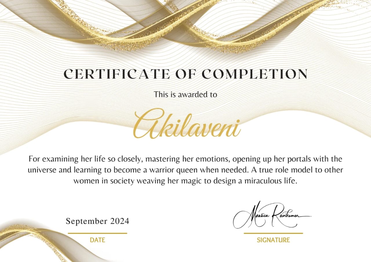 I Akilaveni Periasamy, started working on myself with my mentor Maalica Ravikumar in 2024. I was who emotionally very weak, getting angry very often, though I was optimistic person, I put down myself to more method and exercise. I realized that empowering women was my favourite part of the job. Suddenly got an enlightment I wanted to help people who struggling in their life